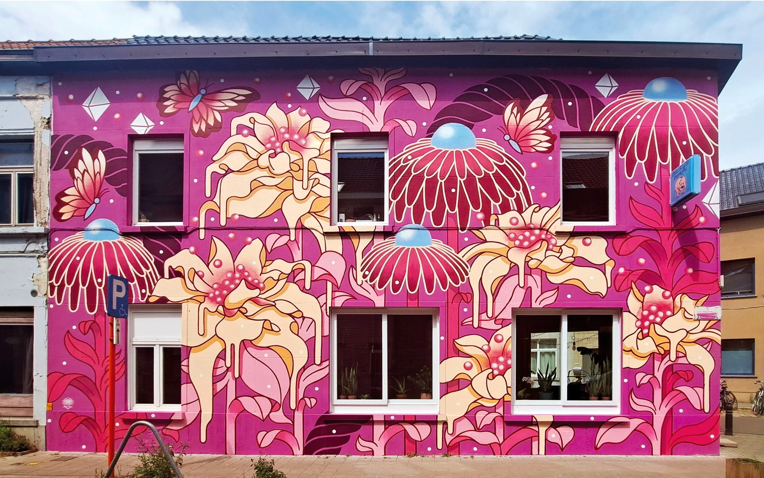The design draws from real flowers, reimagined through simplified forms and vivid colors to create an otherworldly composition. Its strong verticality evokes a blooming forest, rooted in the neighborhood’s botanical history and the legacy of botanist Louis van Houtte.